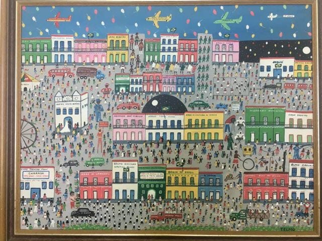Meu pediatra tinha o consultório repleto de quadros grandes que ele mesmo pintava. Eram bem coloridos com muitas pessoas ocupando cenários festivos típicos do regionalismo brasileiro. Lembro de ficar um bom tempo encarando as obras, tentando ter a certeza de que reconhecia cada pessoínha, como se olhasse um livro de Onde está Wally.