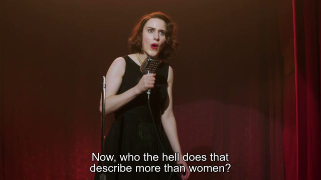 Em um episódio dela, Midge (nossa protagonista) entra no palco irritada com um grupo de homens comediantes que se apresentaram antes dela: